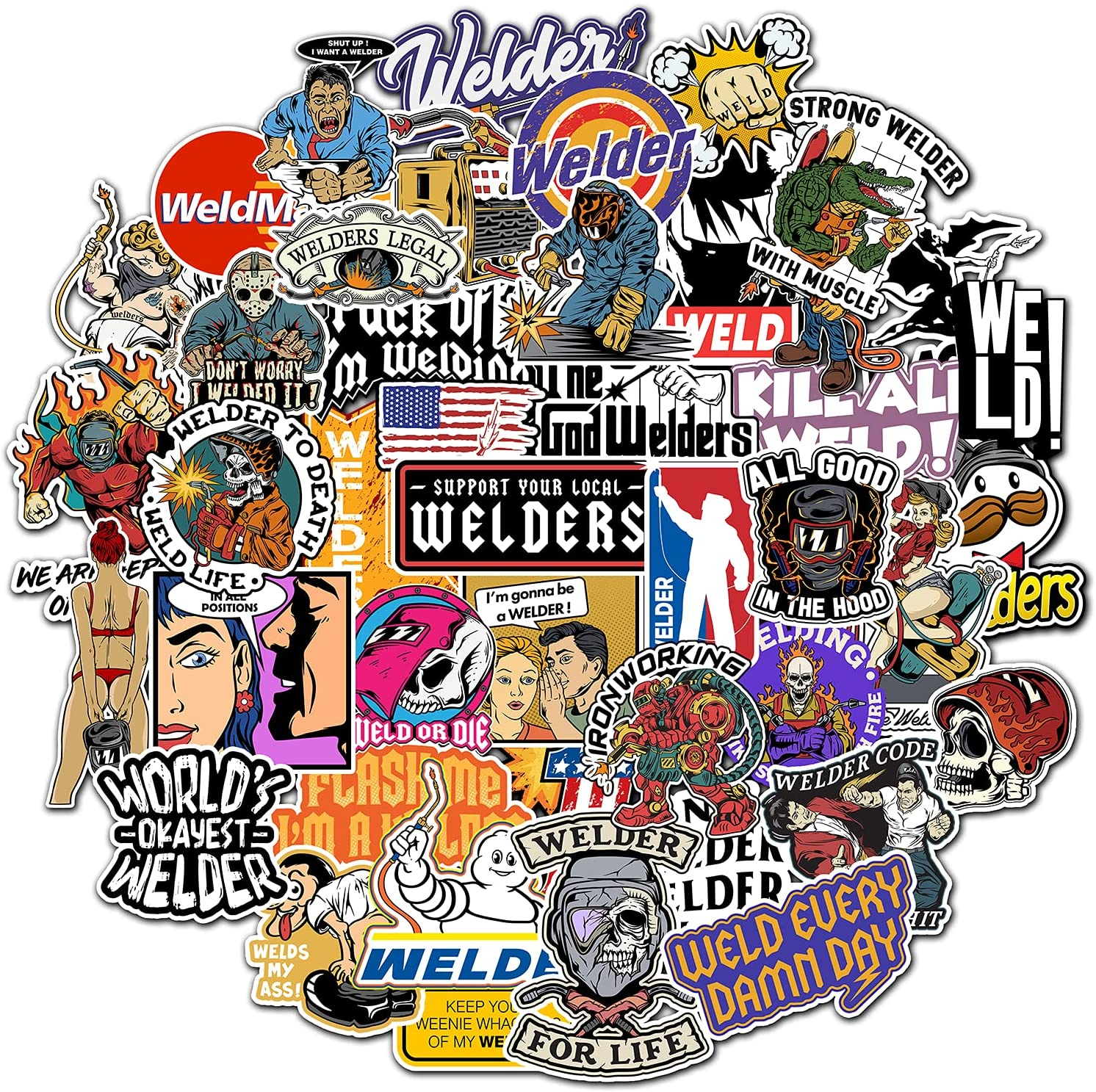 50 PCS Welder Hard Hat Stickers, Waterproof Welding Logo Vinyl Decal for Hood Helmet Tool Box Hardhat Car Bumper Window Truck, Assorted Sticker Pack for Construction Laborer Mechanic Toolbox